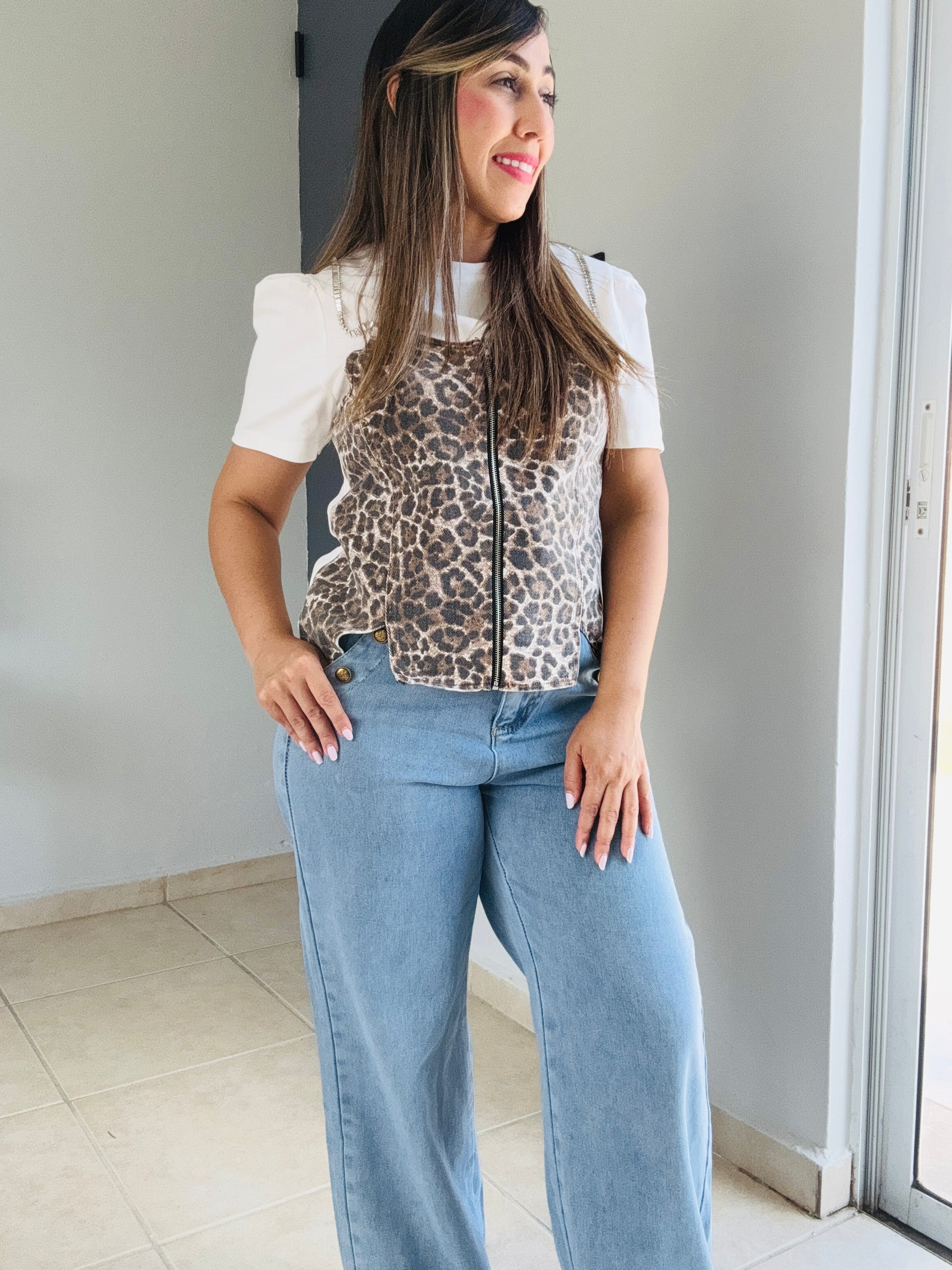 El contraste del animal print con el color block te hará destacar de manera elegante y divertida, mientras que los rhinestones en los manguillos añaden un toque brillante que la convierte en una prenda única en tu clóset.