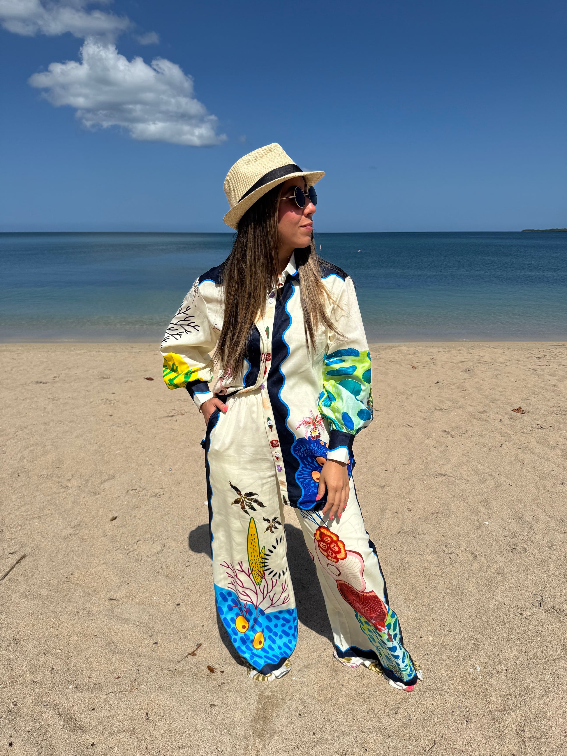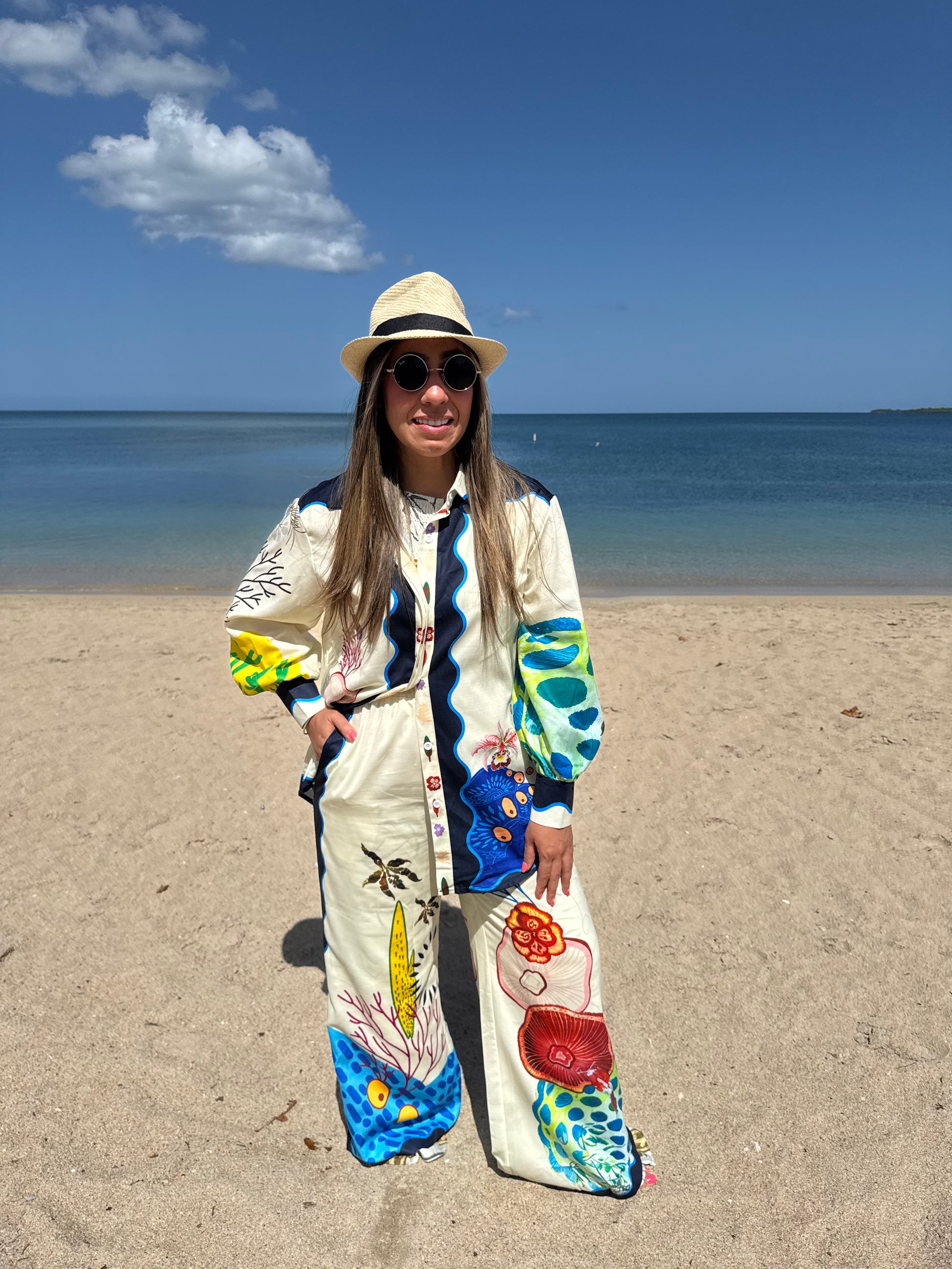 Sumérgete en la frescura y alegría del trópico con esta blusa estampado abstracto en tonos vivos, inspirado en la riqueza de nuestra isla y en la belleza que guarda el mar en su interior: caracoles, corales y colores que hablan de vida.