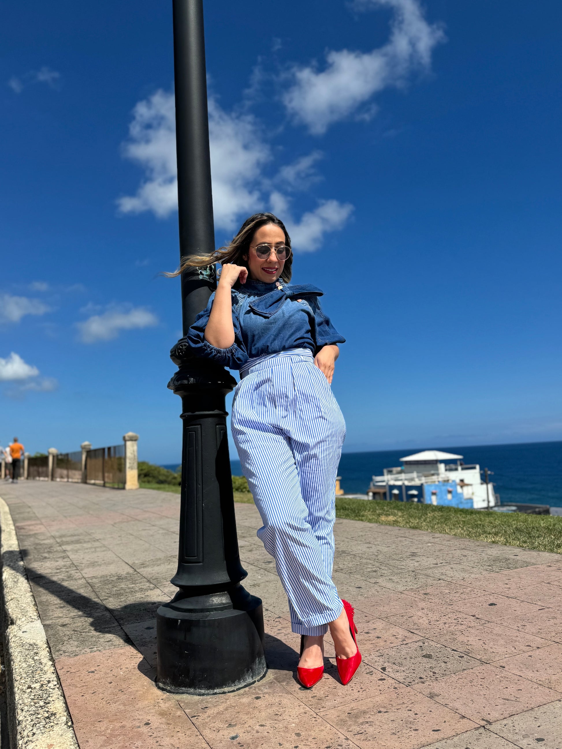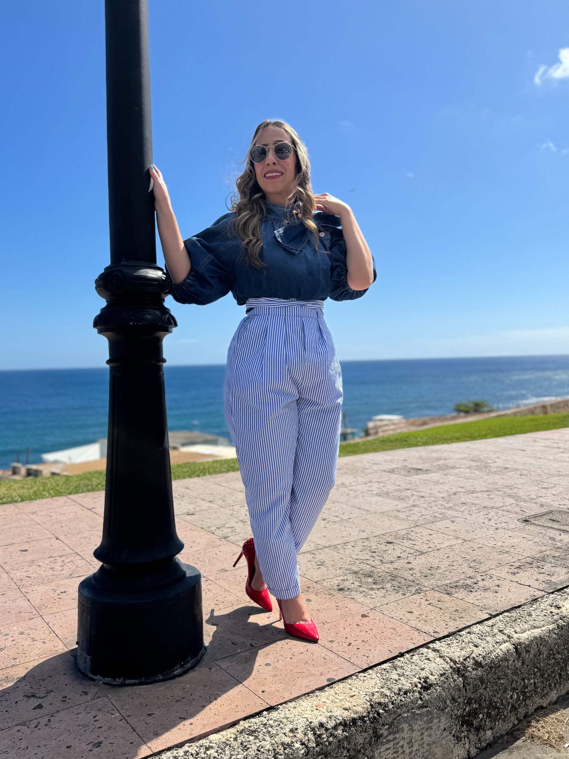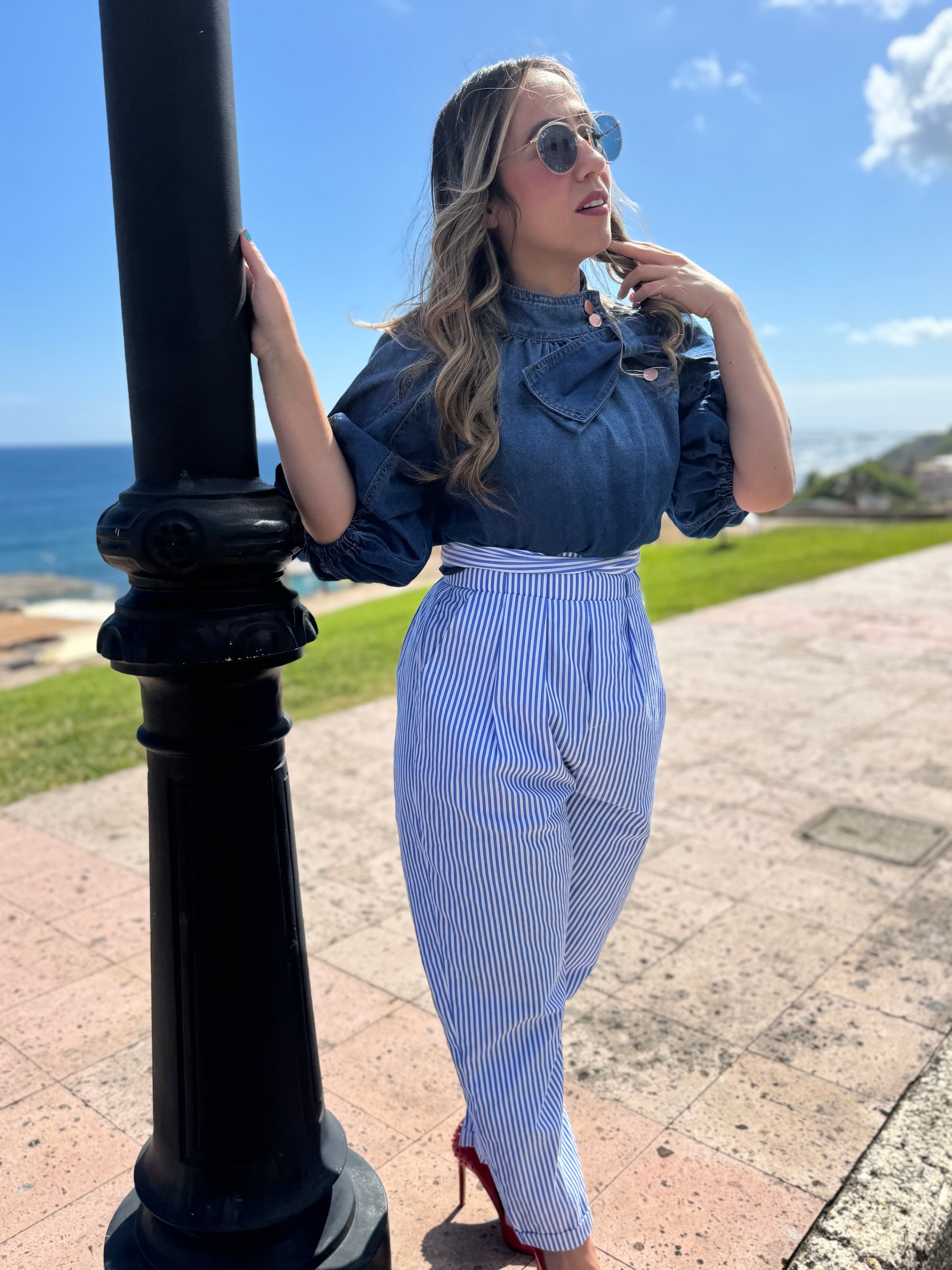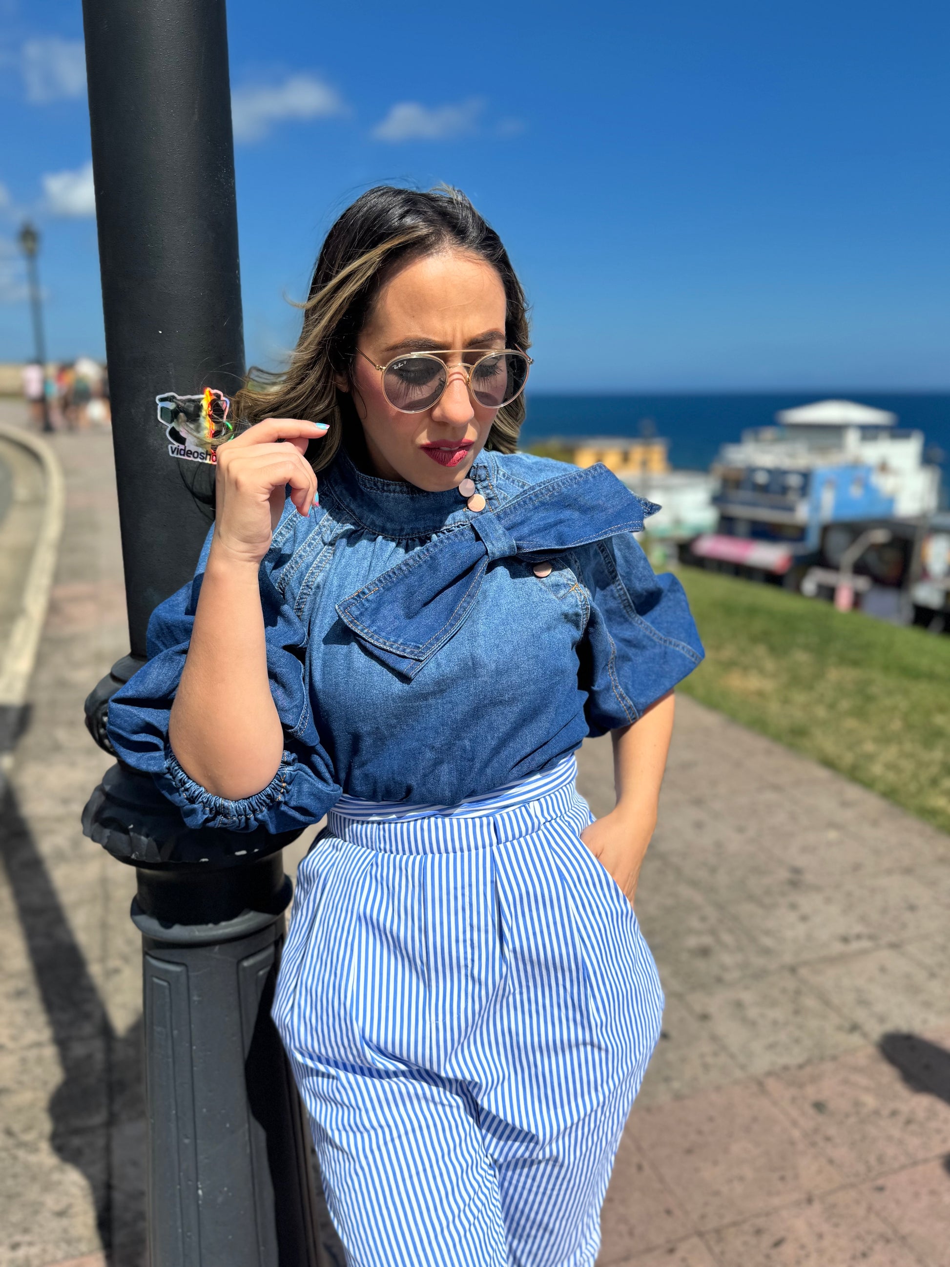 “Gracia Celestial” es un top denim que trasciende las tendencias: con cuello alto, mangas abullonadas y delicados botones, cada detalle ha sido pensado para realzar la feminidad con fuerza y dulzura. El lazo en el cuello no es solo un acento de diseño, sino un símbolo profundo: representa la delicadeza con la que Dios nos mira, envolviéndonos en Su amor y cuidado constante.