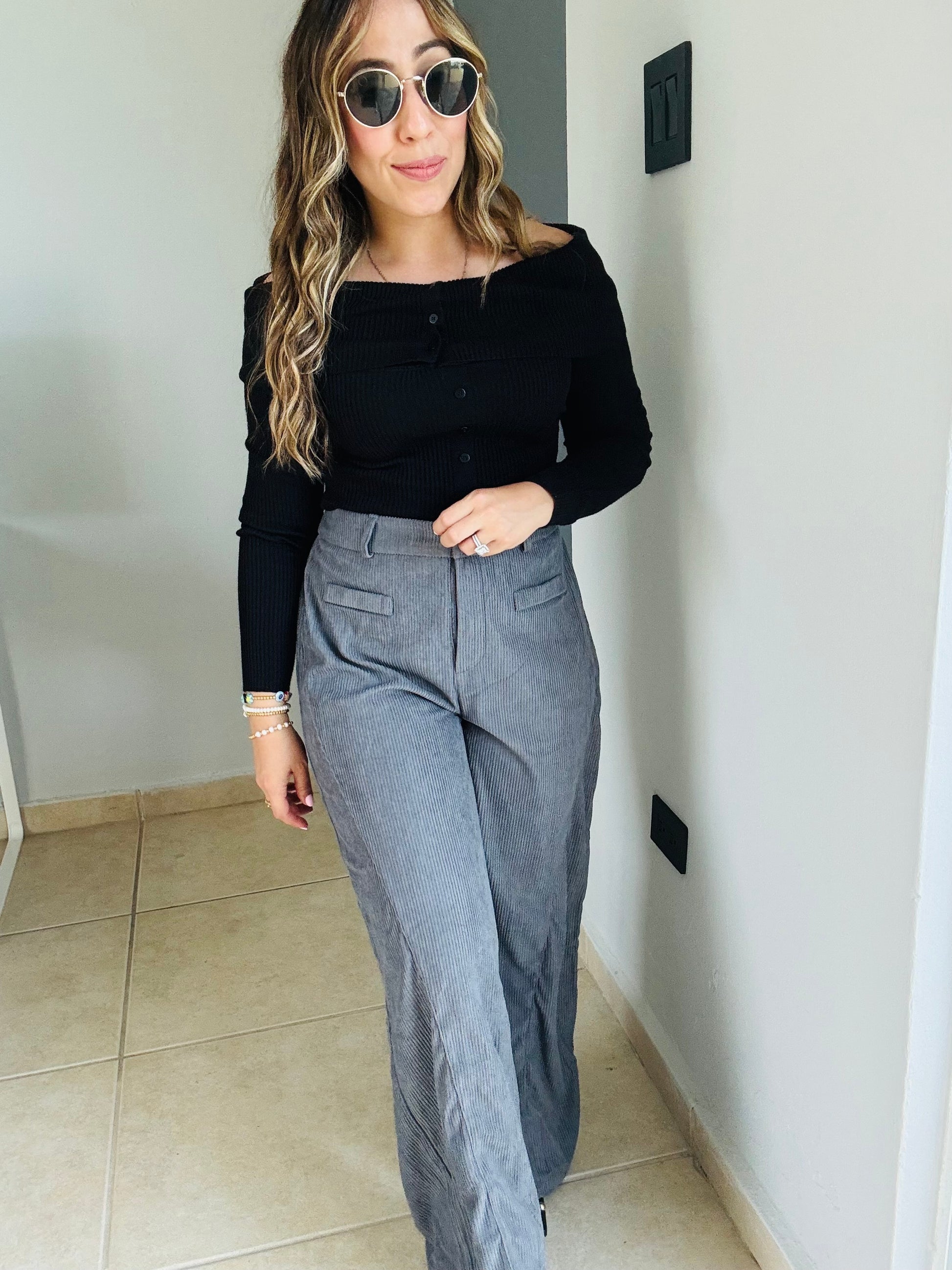 🩶 1. Cielo Nublado — Pantalón Gris Corduroy de corte alto y pierna ancha