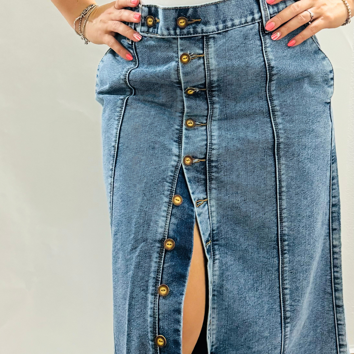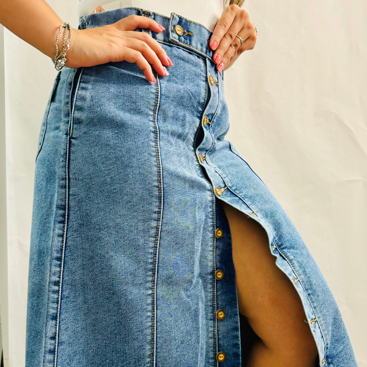 ¡Haz una declaración de estilo con nuestra falda denim larga con botones! Esta prenda, diseñada para adaptarse perfectamente a tu figura gracias a sus botones en la cintura, ofrece una versatilidad infinita para crear looks únicos para cada ocasión. Con su tejido de mahón rígido, sin spandex, disfrutarás de una estructura impecable que te hará sentir cómoda y con confianza todo el día.