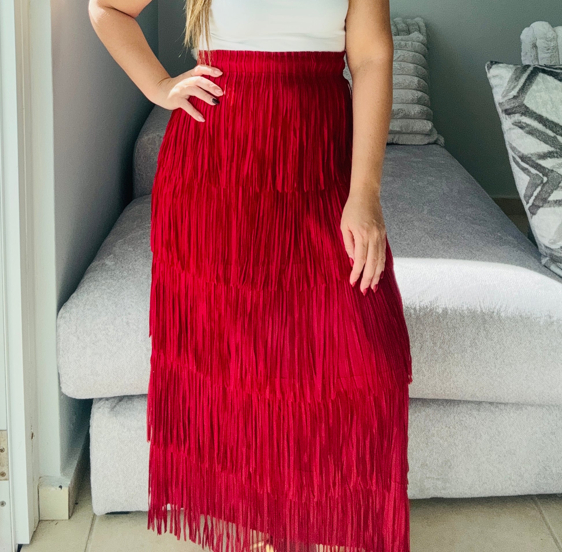 Falda midi bohemia con flecos · Color Burgundy su cintura es elastica.