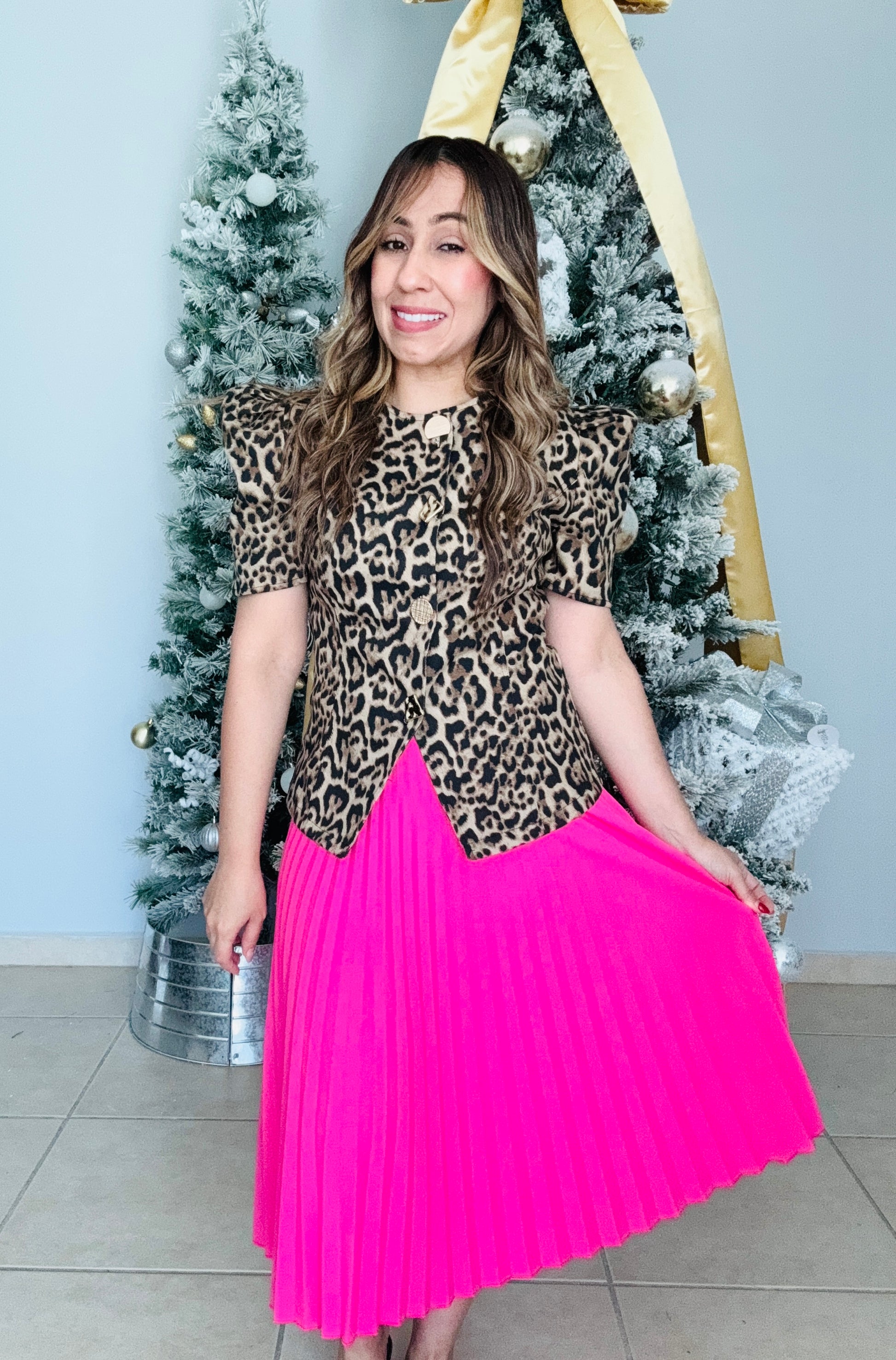 Delicada, femenina y llena de movimiento. Nuestra falda plisada rosada es esa pieza especial que transforma cualquier look en uno lleno de gracia y elegancia. Su tono suave aporta dulzura y frescura, perfecta para celebrar, compartir y brillar con estilo en cualquier ocasión. Cuenta con cintura elástica, lo que la hace súper cómoda y adaptable a diferentes tipos de cuerpo. Es one size, ideal para llevarla desde un look casual hasta uno más elegante según cómo la combines. En la foto se ve un rosa como fushia pero es mas claro.
