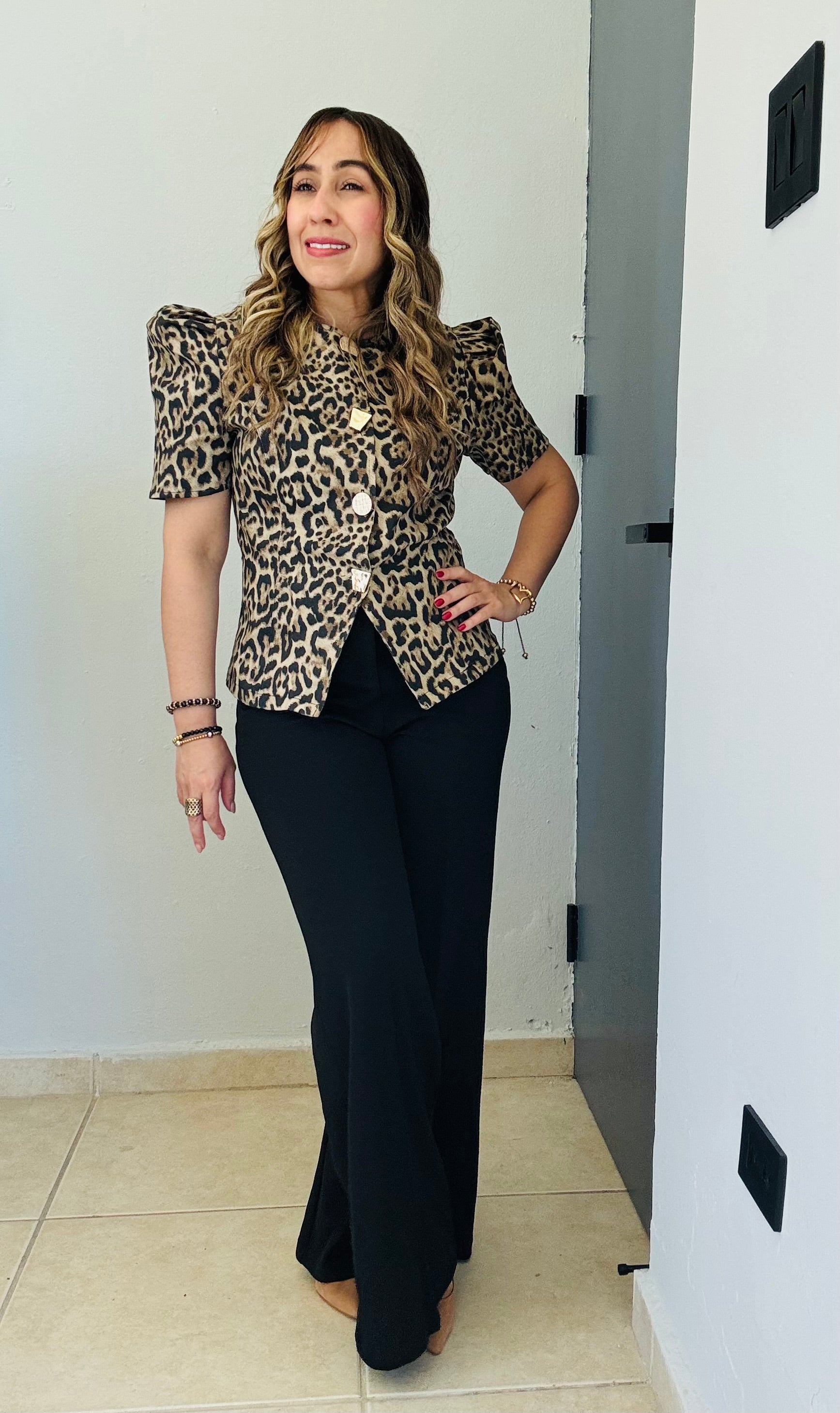 La blusa Fuerza de Otoño combina la elegancia del animal print con la estructura moderna de un blazer. Sus botones dorados elevan cada detalle, creando un look poderoso, femenino y lleno de carácter.