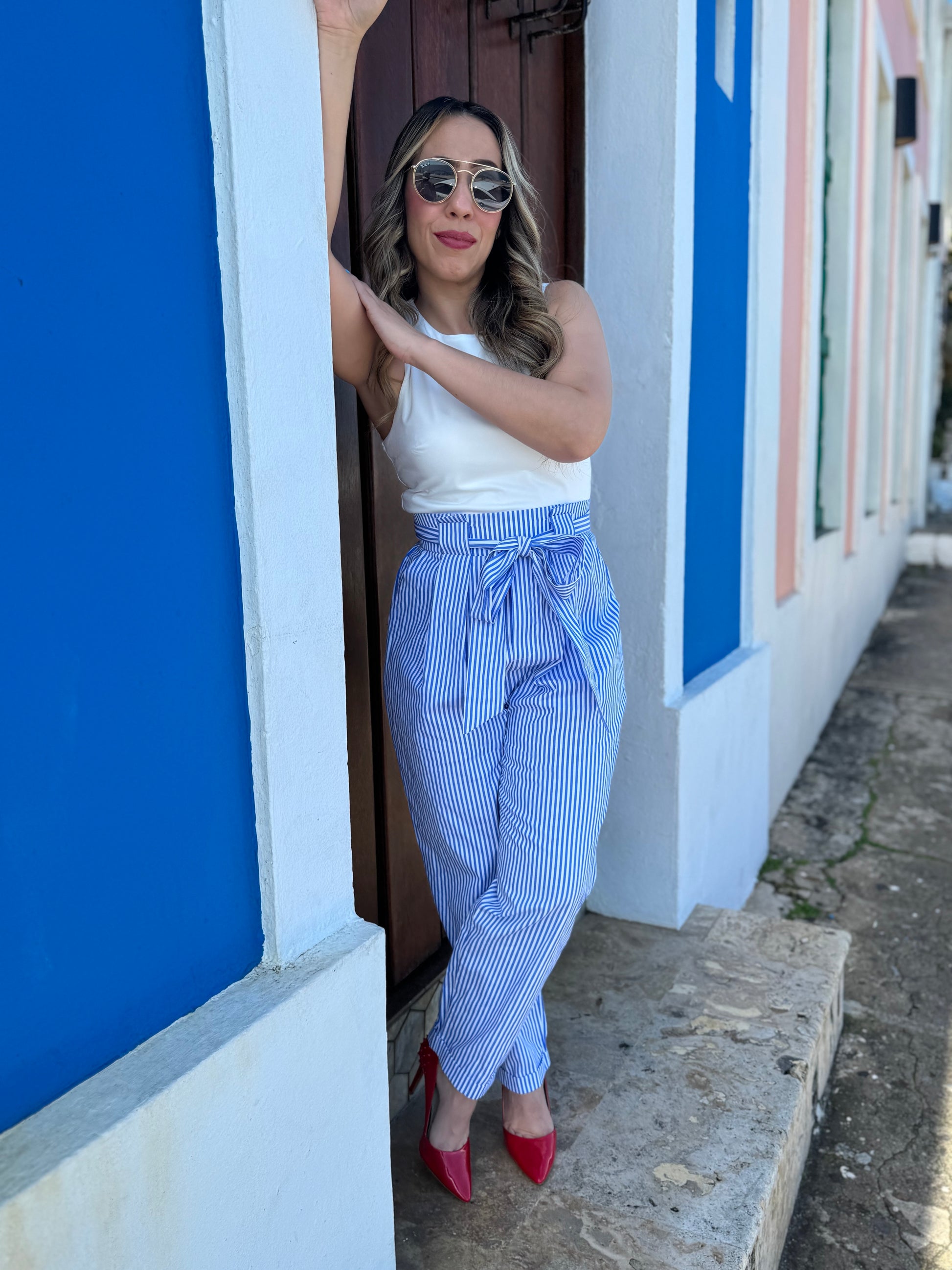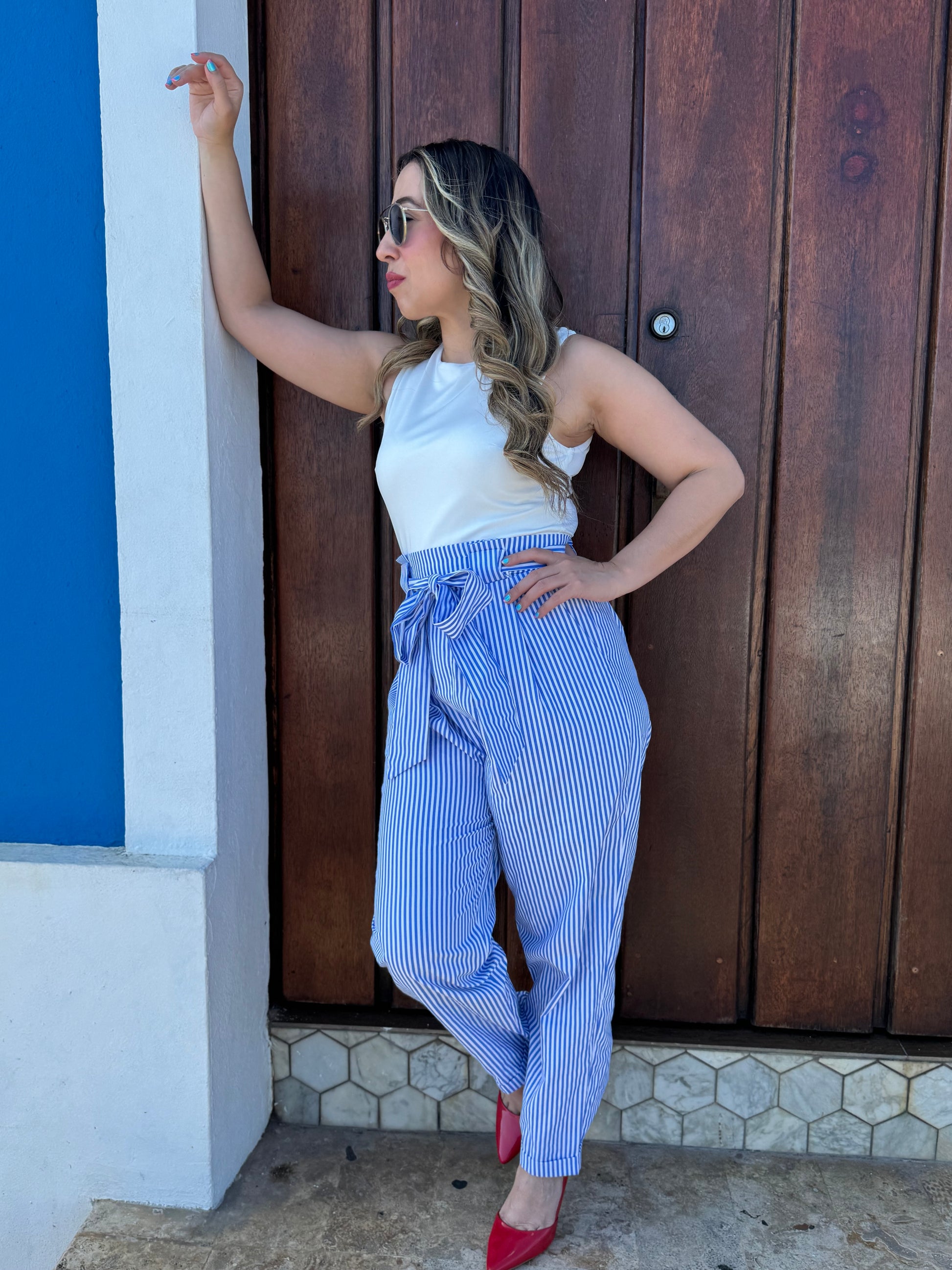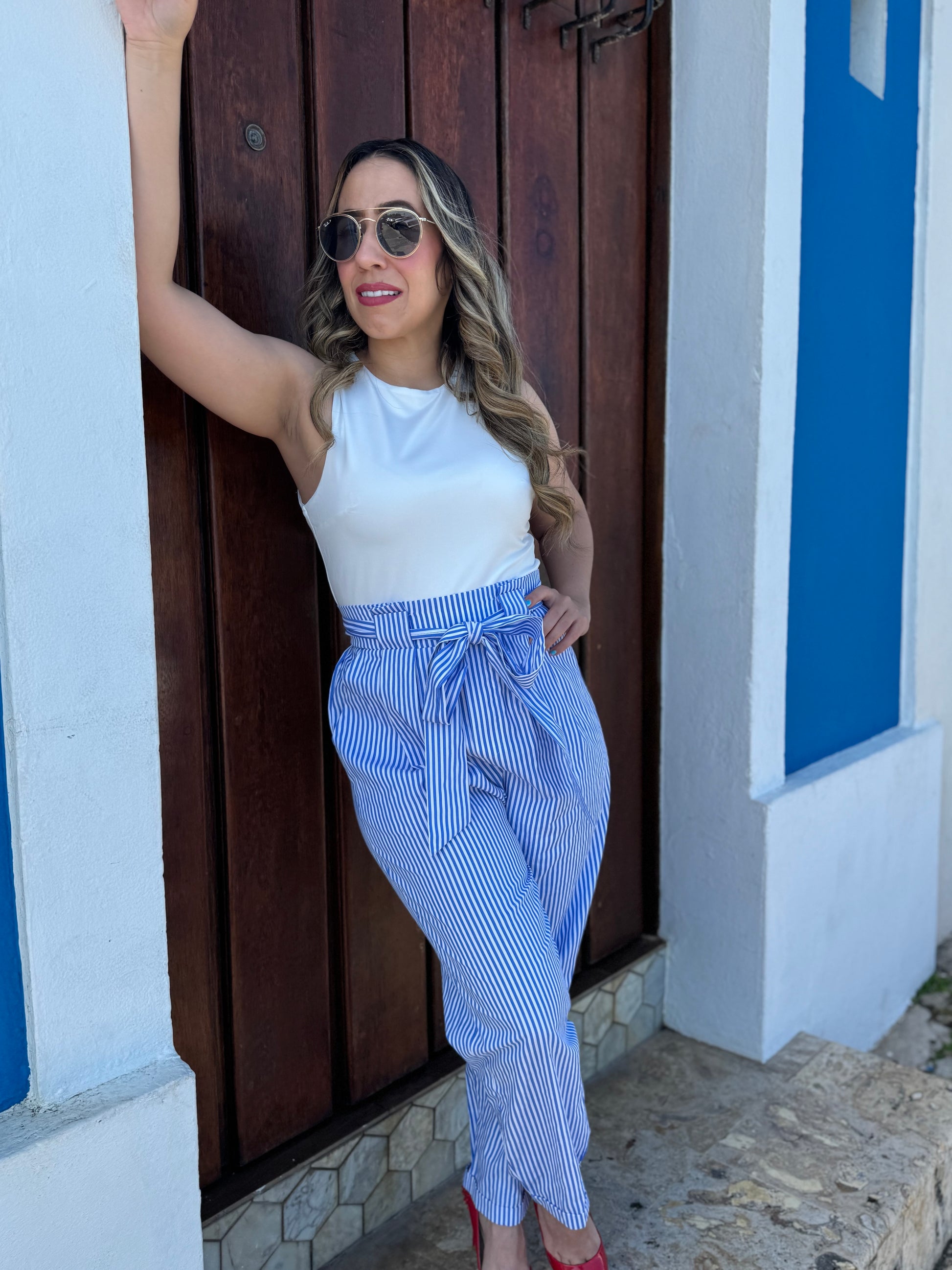 Es una declaración de quién eres en lo eterno. El blanco en la parte superior representa pureza, luz y redención. Es el recordatorio de que, a pesar del pasado, Dios te ha vestido de una nueva identidad. Las rayas azules en el pantalón evocan el cielo mismo, ese espacio infinito donde las oraciones suben y los sueños nacen. Azul es también el color de la fe, la calma y la confianza — tres cualidades que una mujer de Dios lleva con elegancia.