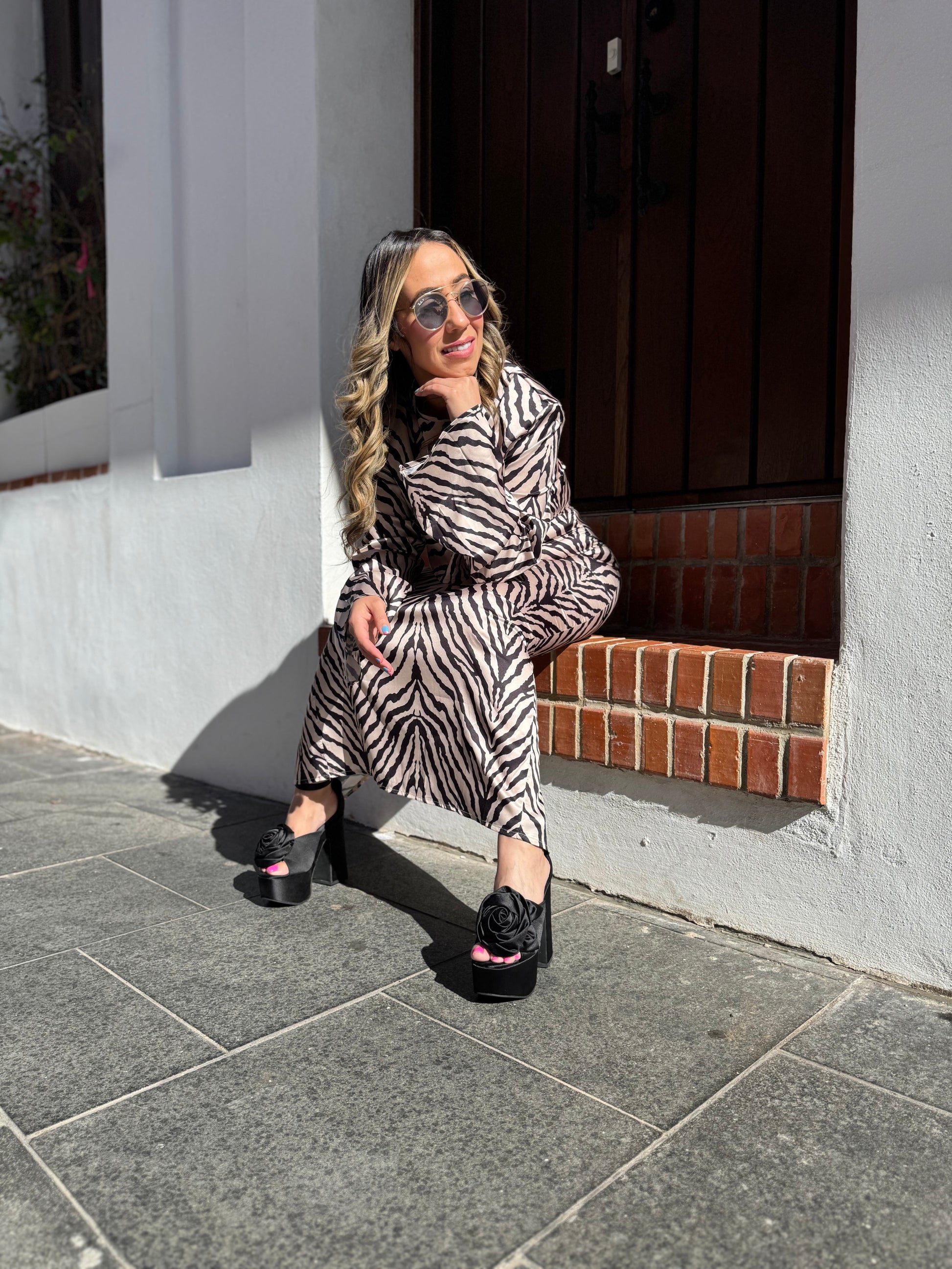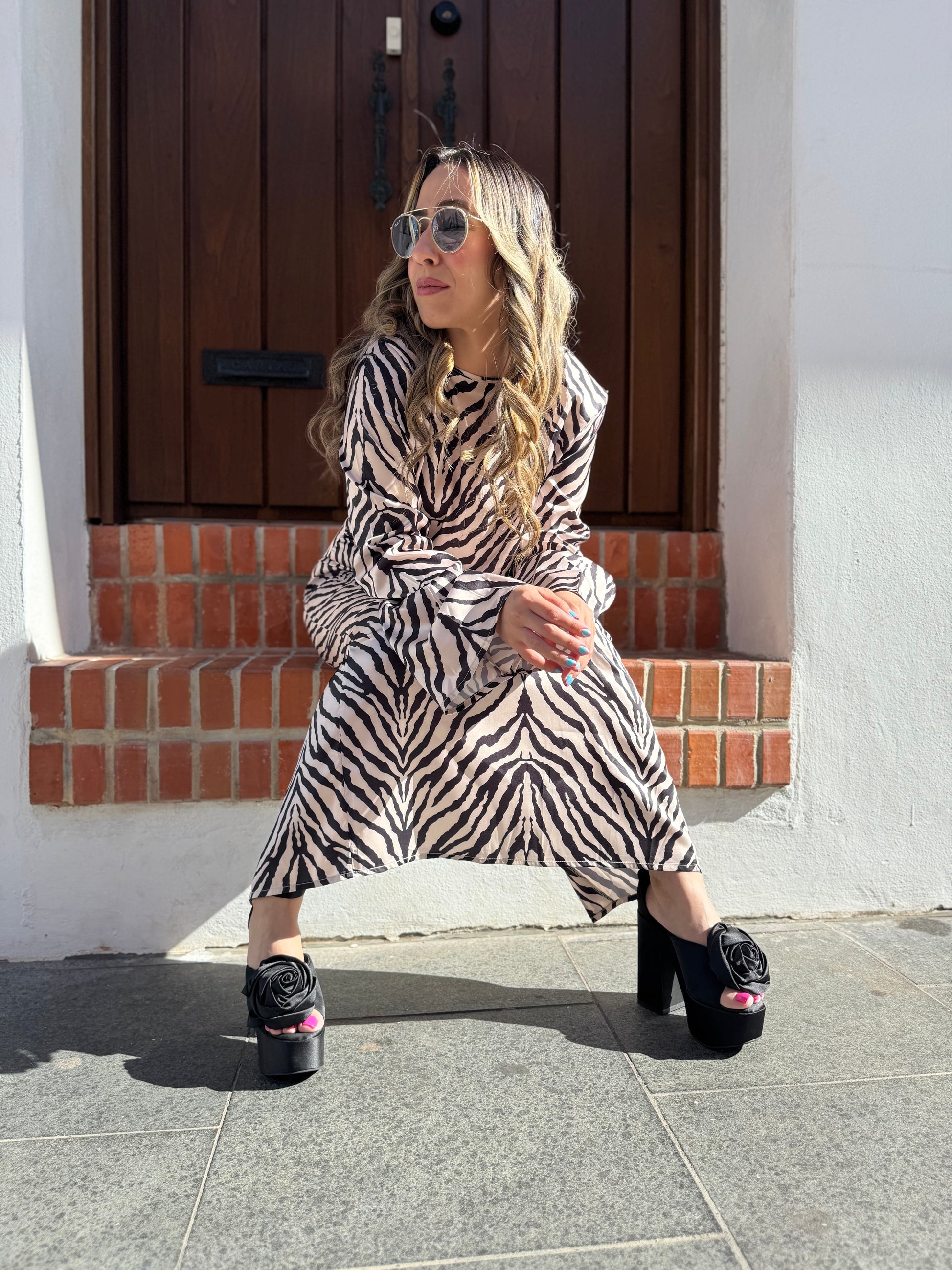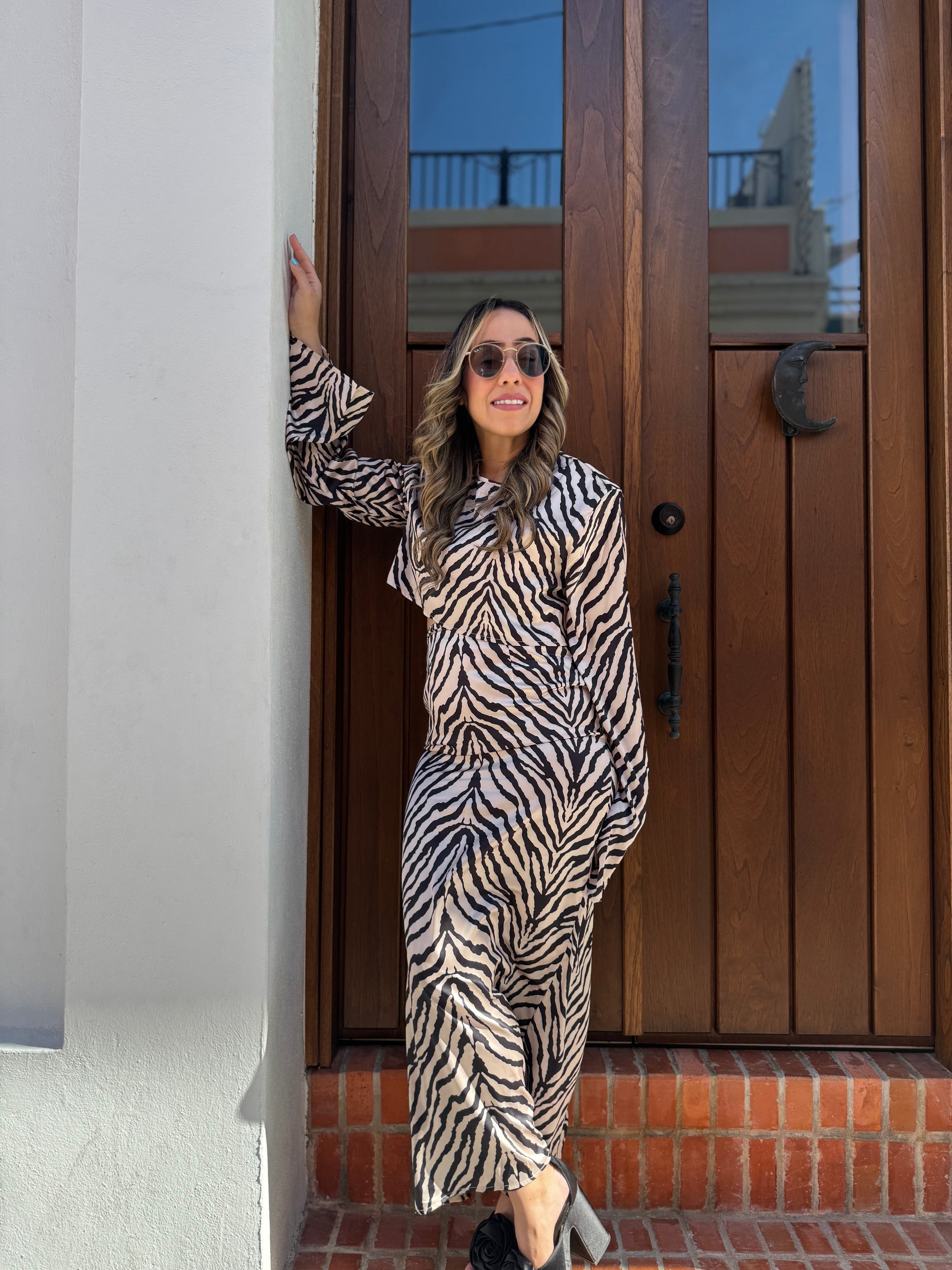Atrévete a destacar con “Huellas del Creador”, un conjunto de top y falda que fusiona sensualidad y fuerza con un estampado de cebra tan audaz como simbólico. Las aberturas estratégicas en la cintura y las mangas acampanadas aportan un aire sofisticado y rebelde, mientras que el corte ceñido realza la silueta con elegancia feroz. Perfecto para noches que merecen ser inolvidables o eventos donde tu presencia hable por sí sola.