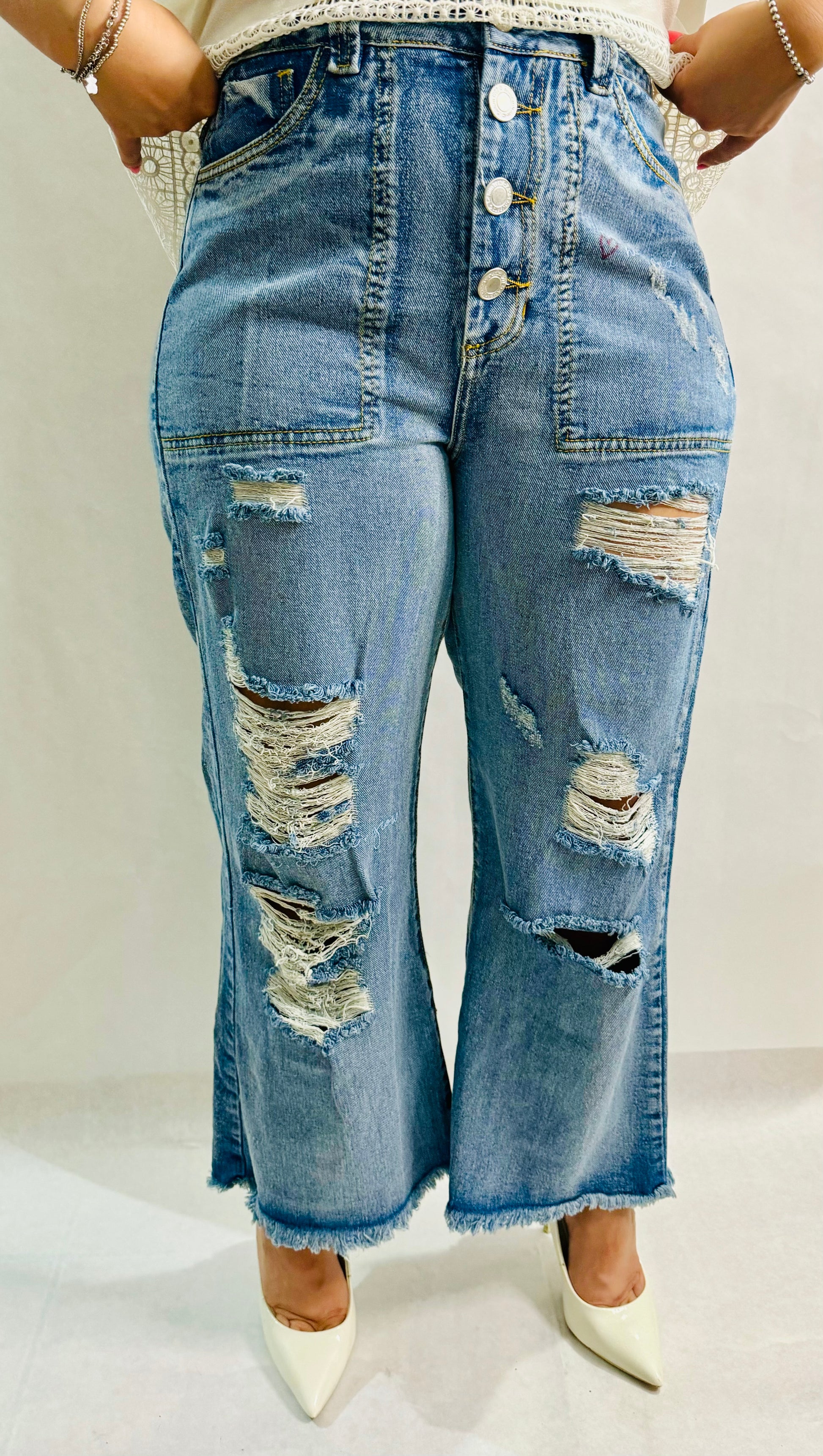 Siente la libertad de movimiento y el poder de tu estilo con nuestro elegante pantalón palazo de cintura alta (High Waisted). Con un diseño único que presenta aberturas y áreas desgarradas, este pantalón no solo destaca tu personalidad audaz, sino que también te permite moverte con total comodidad y estilo. Los flecos en los bolsillos delanteros y traseros le añaden un toque de originalidad que convierte a este palazo en una prenda imprescindible para cualquier ocasión.