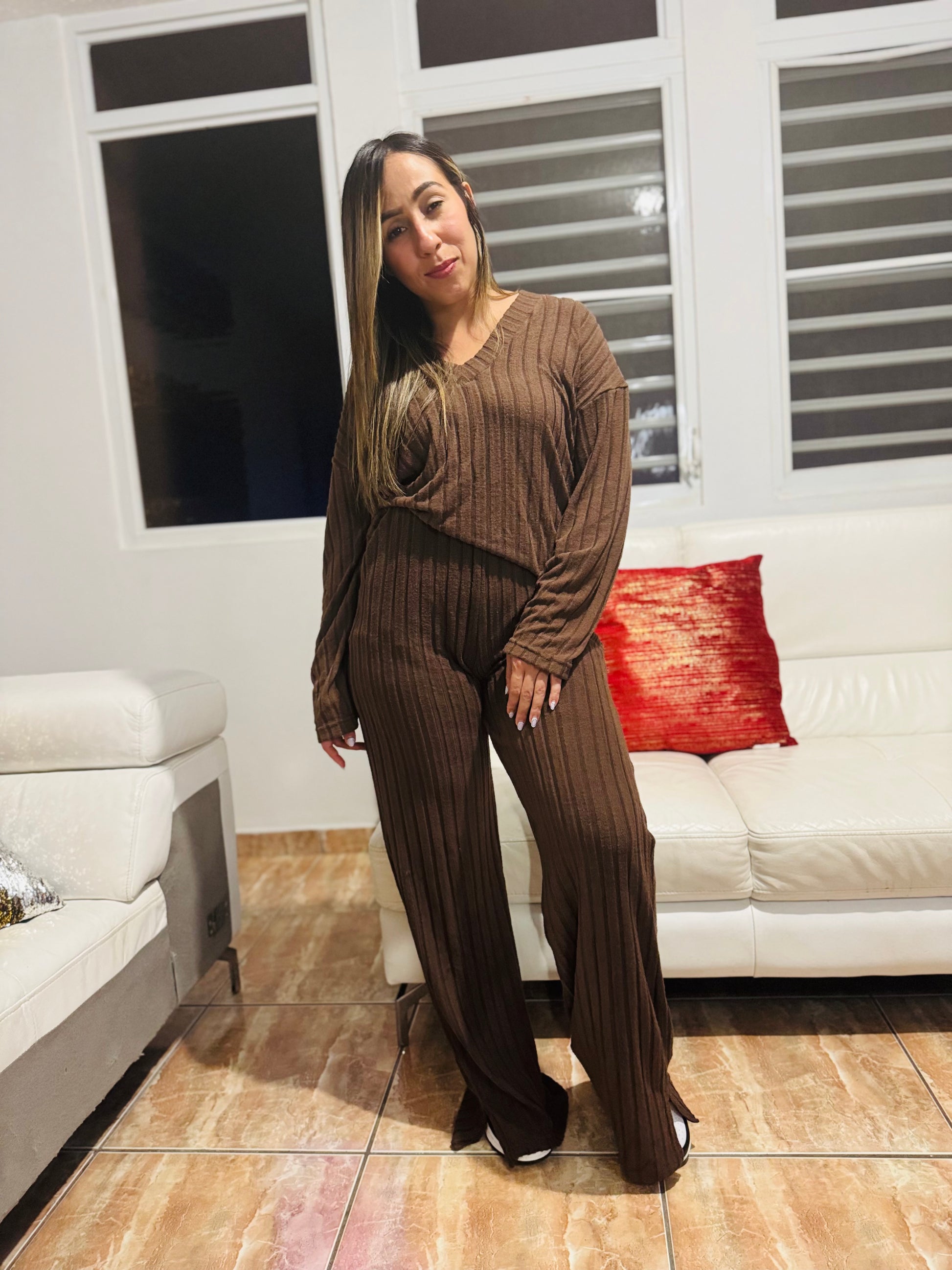 Incluye suéter de manga larga con escote en V y pantalón de pierna ancha para máxima comodidad y estilo.