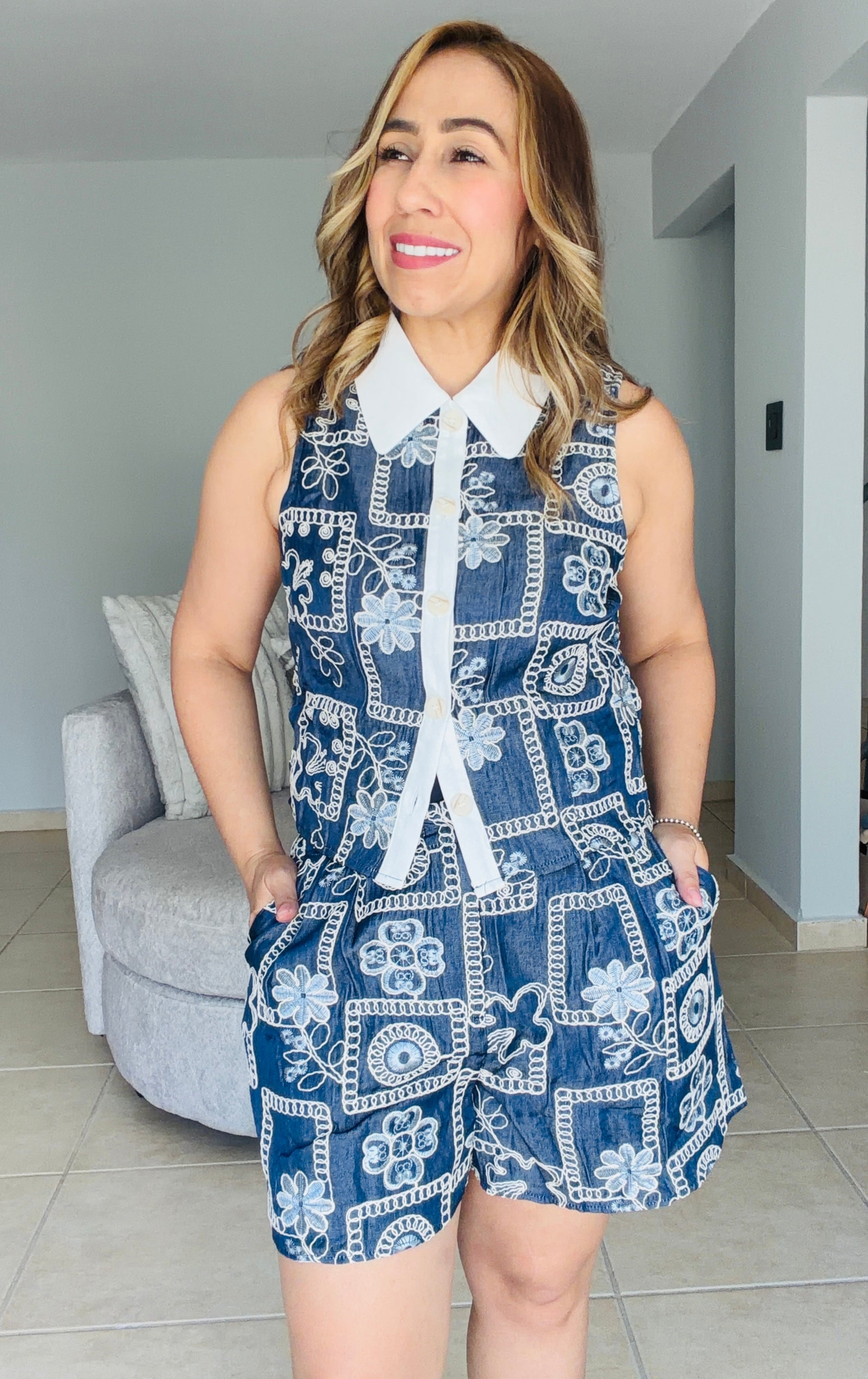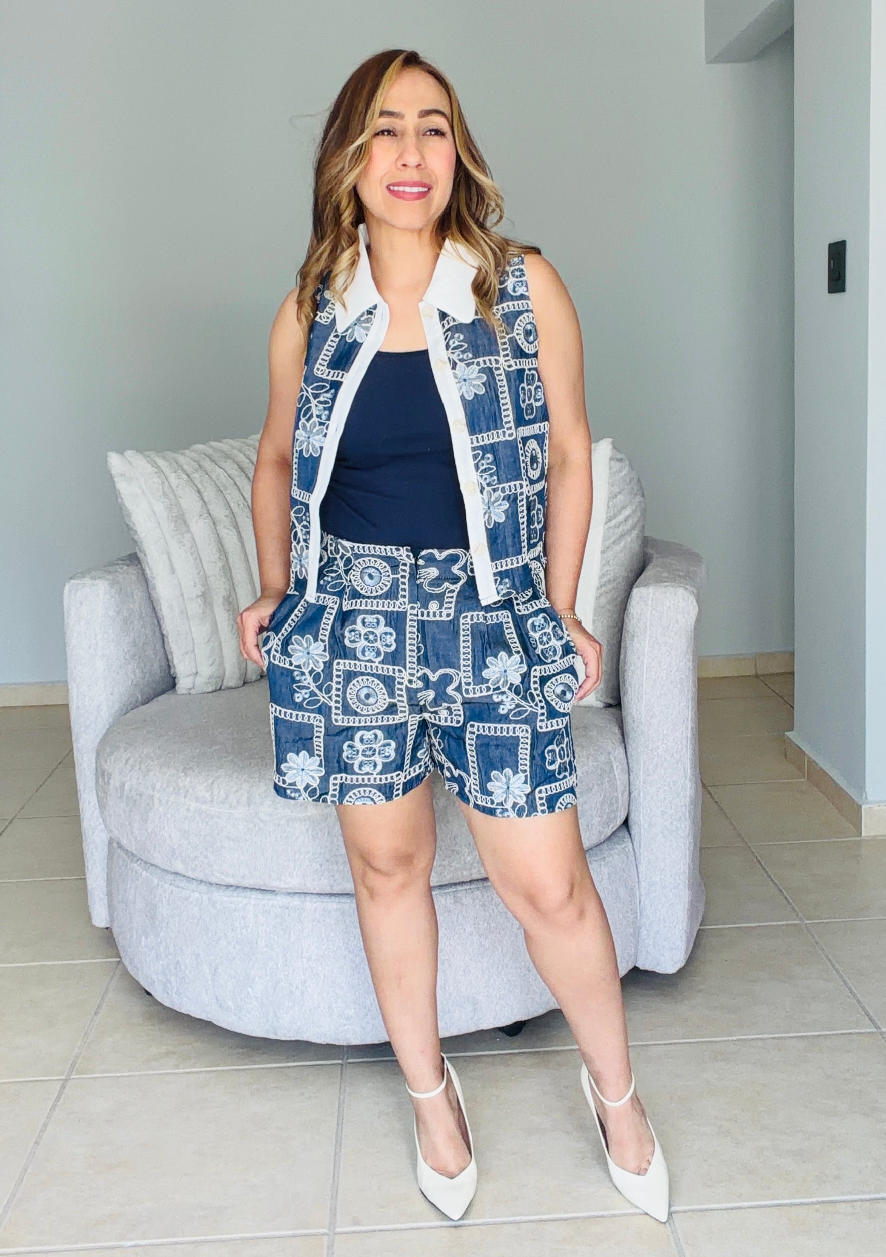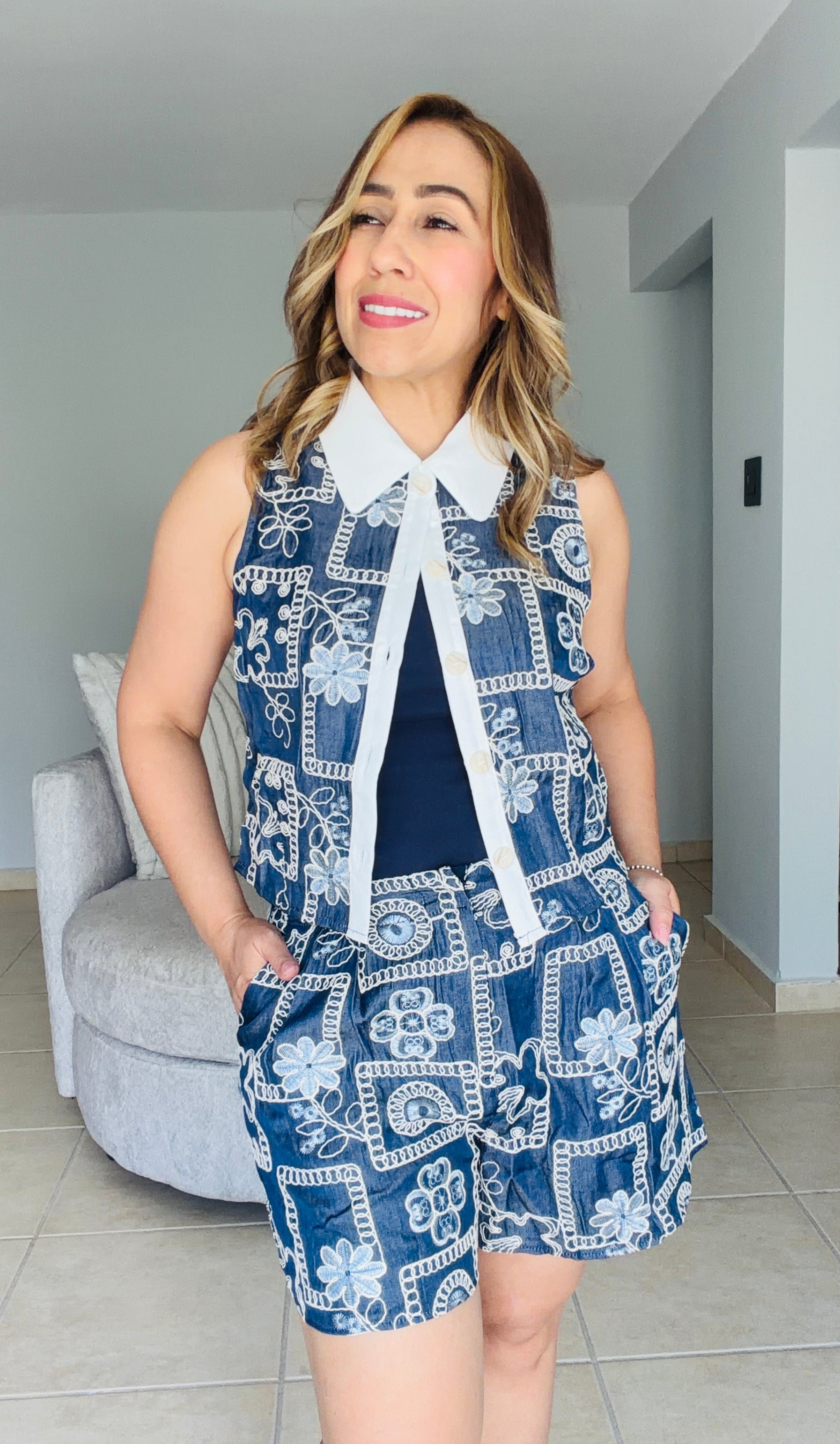 Este set de chaleco y shorts con cuello bordado floral fue diseñado para la mujer que ama verse hermosa, pero aún más, reflejar luz, fe y propósito en cada paso.