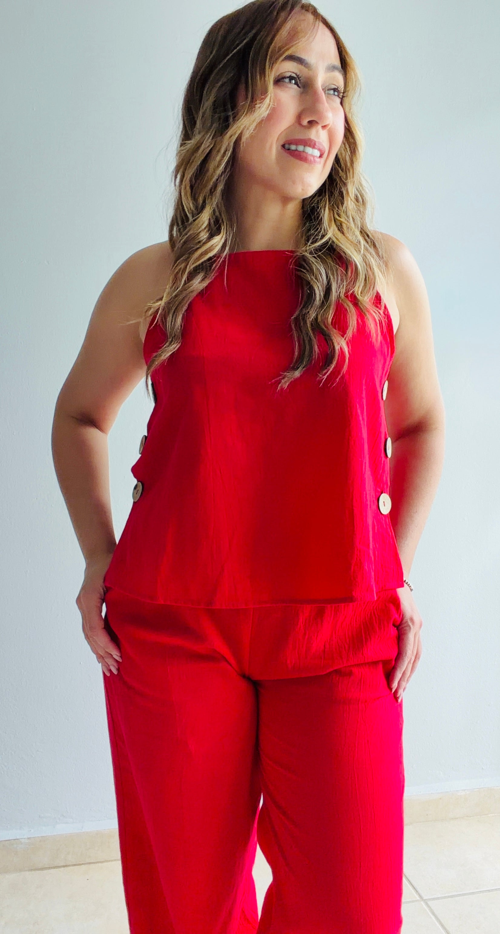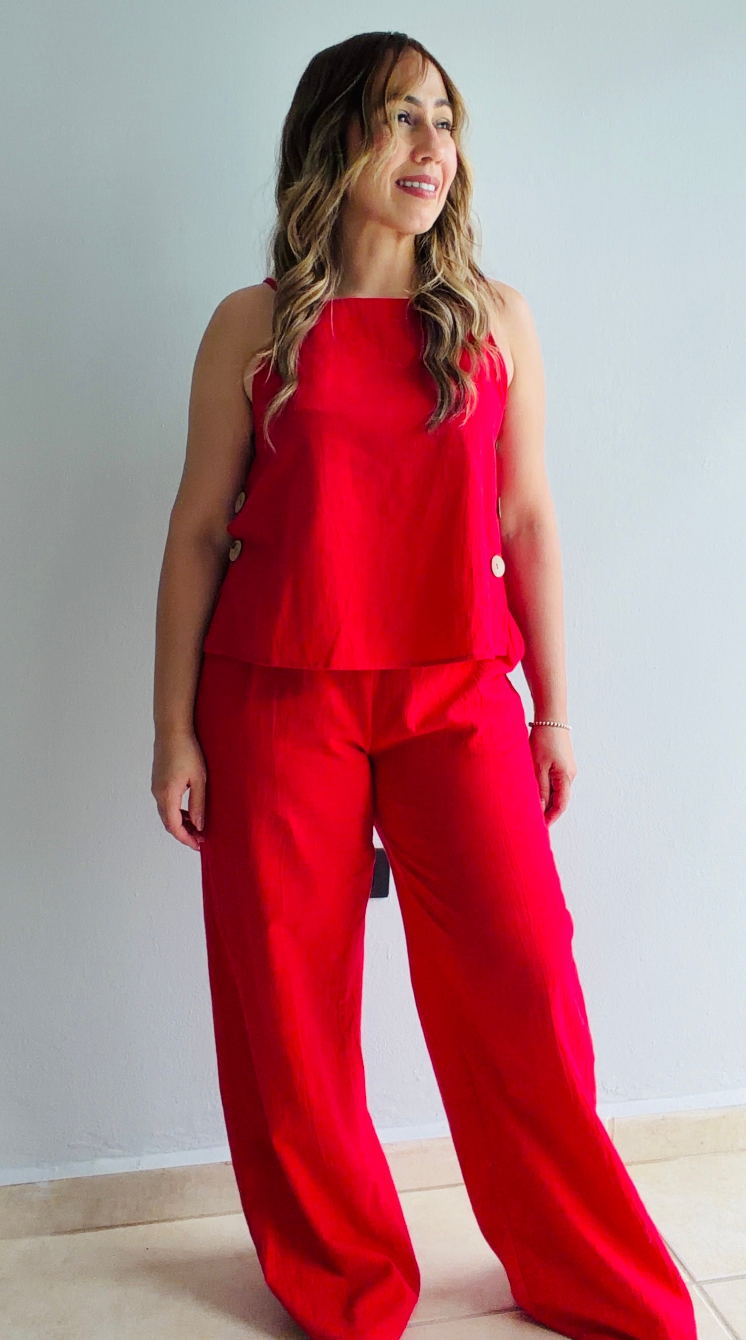 La blusa incorpora botones laterales con acabado tipo madera, aportando un detalle natural y moderno que eleva el diseño. El pantalón relaxed fit incluye banda elástica en la parte trasera para mayor ajuste y comodidad, además de bolsillo lateral funcional que añade practicidad sin perder estilo.